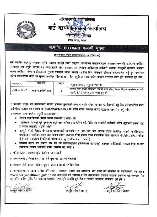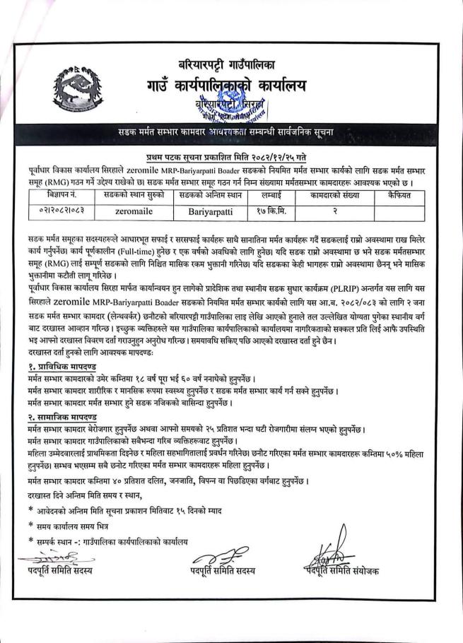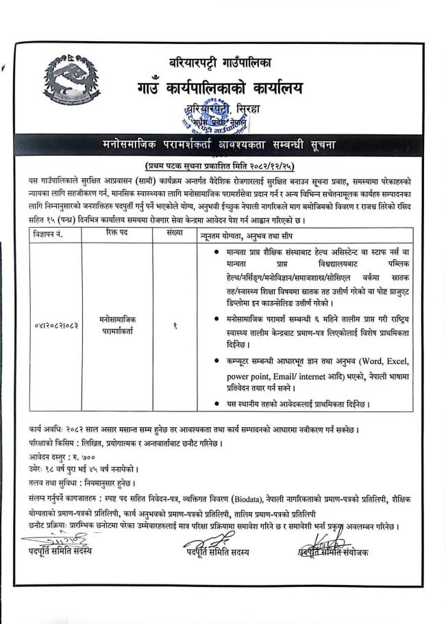 » गणक,बनप्राबिधिक, मनाेसामाजिक परामर्शकर्ता, अ.न.मि. र सडक मर्मत कामदार आवश्यकता सम्बन्धी सूचना ।