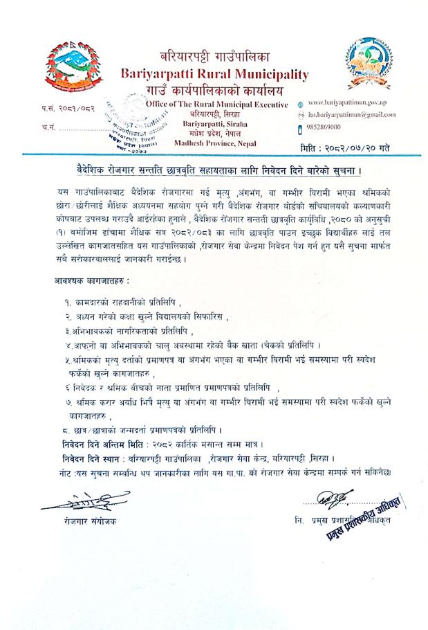 » वैदेशिक राेजगार सन्तति छात्रवृत्ति सहायताका लागि निवेदन दिने वारेकाे सूचना ।