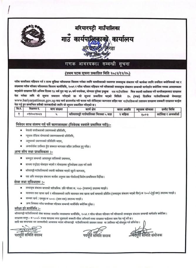 गणक,बनप्राबिधिक, मनाेसामाजिक परामर्शकर्ता, अ.न.मि. र सडक मर्मत कामदार आवश्यकता सम्बन्धी सूचना ।