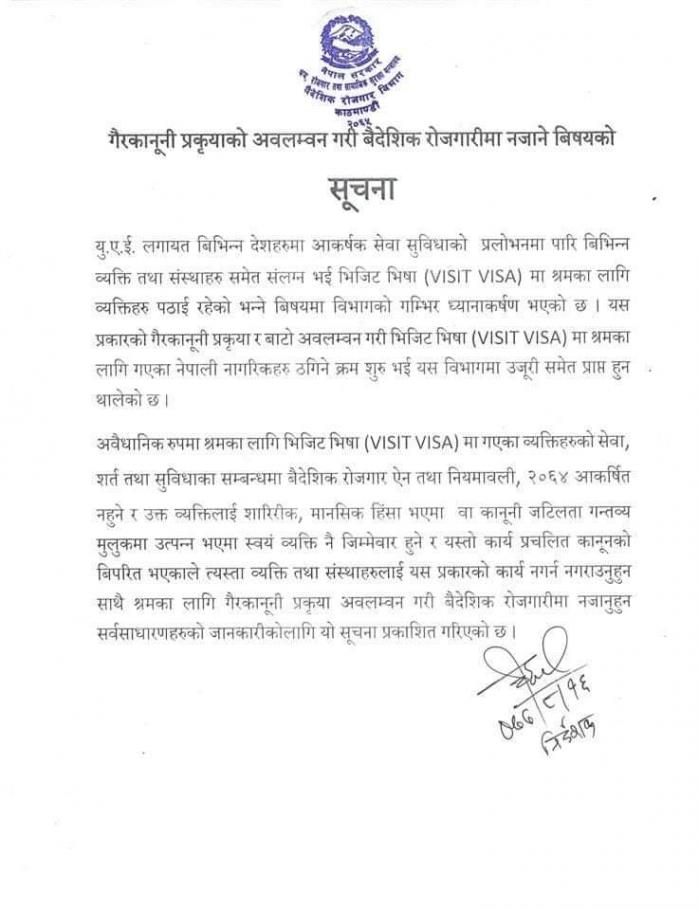 गैरकानूनी प्रकृयाकाे अवलम्वन गरि बैदेशिक राेजगारीमा नजाने विषयकाे सूचना