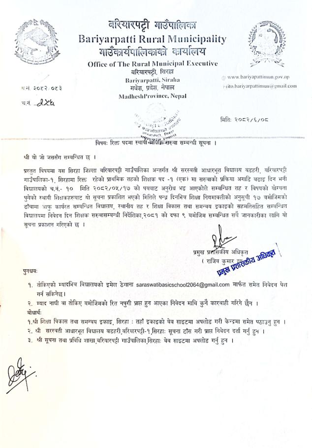 रिक्त पदमा स्थायी शिक्षक सरूवा सम्बन्धि सूचना ।
