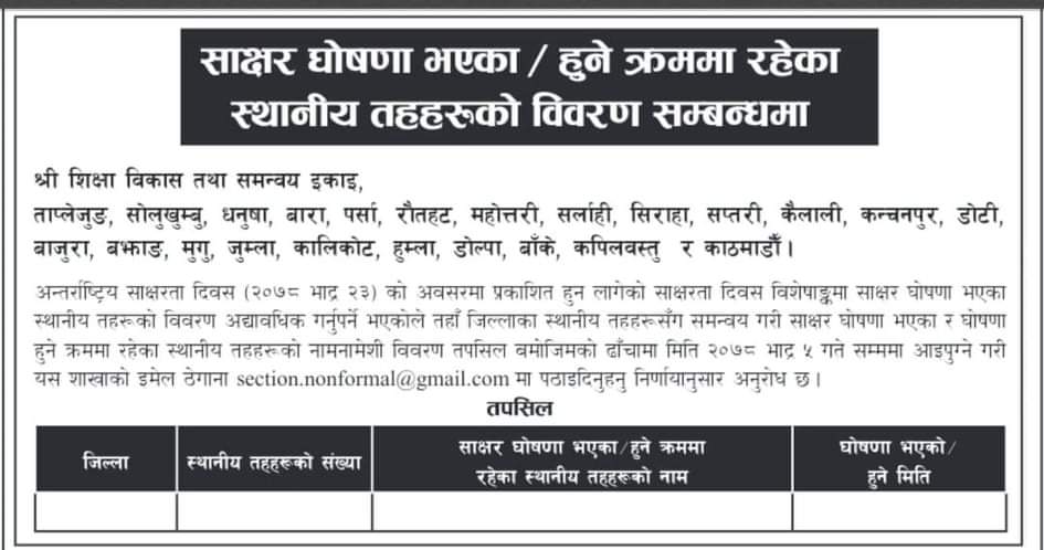 साक्षर घाेषणा भएका/ हुने क्रममा रहेका स्थानीय तहहरूकाे विवरण सम्बन्धमा ।