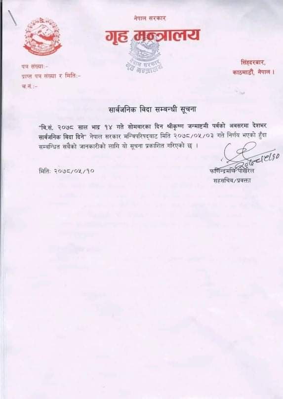 सार्वजनिक विदा सम्बन्धी सुचना ।